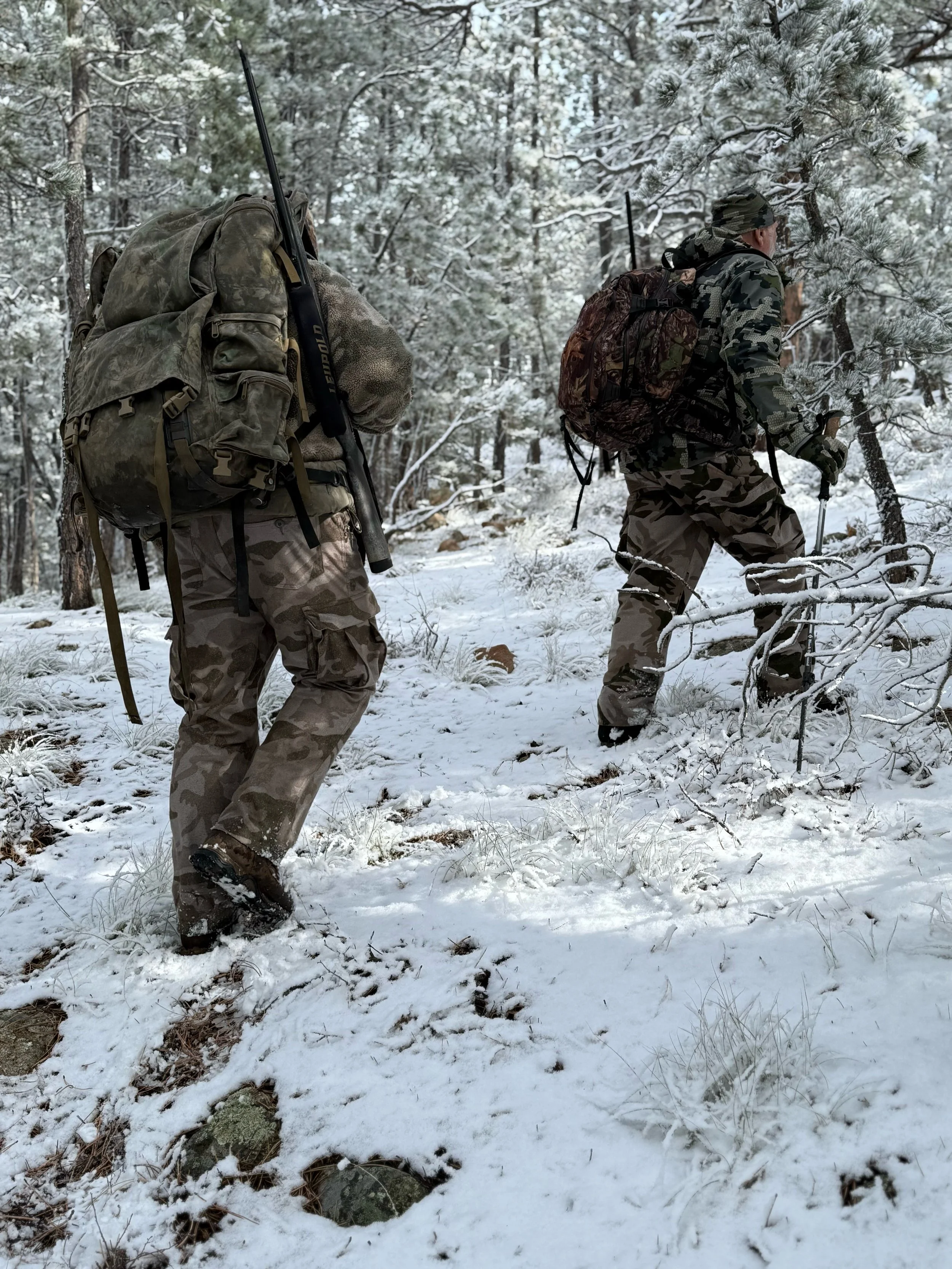 On day four as we pulled up to the Yurts the snow was coming down fast and the wind was blowing hard. I will have to say the wind blew every single day at least 30 MPH with gust to 50-60. It was brutal! We sat there for about an hour with no change so we decided to go hunt in some timber about an hour away. Another friend Don Farrier had told us about this area to hunt when we wanted a change of scenery. It had public access from a small county road. It was a fairly tough climb initially but once on top it was easy going. We found an old four-wheeler trail on top and we slowly hunted along it. About an hour into our walk on the trail, we cut what looked like a big bull’s track walking right down the middle of the trail. Since it had just snowed, we knew it was fresh. Sagen and Nathan followed it as it dropped off the mountain. After about a half an hour and not seeing anything, they returned to the four-wheeler trail. We made it off the mountain at dusk. Another day without seeing an elk.